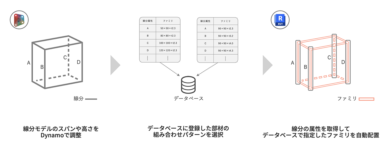 Dynamoで線分ベースの形状をパラメトリックに生成できるアルゴリズムを開発。さらに線分に応じたRevitファミリの自動割付を行う専用プラグインを開発し、テント倉庫の初期設計を効率化。